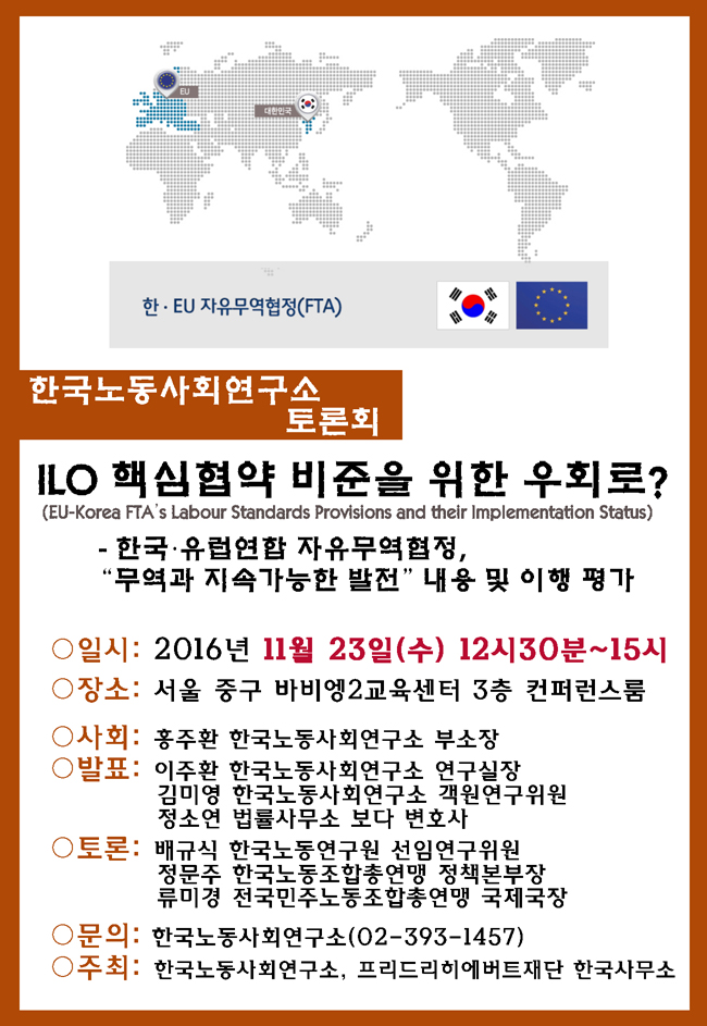 한국노동사회연구소는 오는 11월 23일(금) 오후 12시 30분부터 토론회 'ILO 핵심협약 비준을 위한 우회로? '를 개최합니다. 본 토론회는 프리드리히 에버트 재단 한국사무소와 공동 주최합니다.