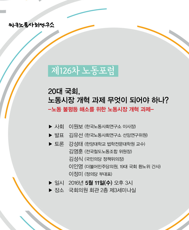 한국노동사회연구소는 오는 5월 11일 오후3시에 제126차 노동포럼 '20대 국회, 노동시장 개혁 과제 무엇이 되어야 하나? '를 개최합니다.