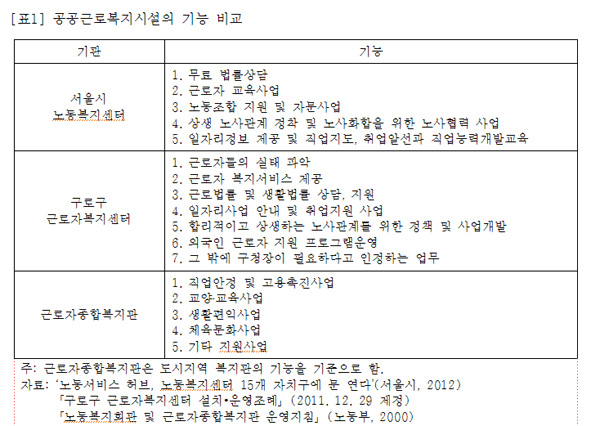 서울시 노동복지센터에게도 이와 유사한 문제가 제기되리라 봅니다. 실제 작년 하반기 서울시정운영위원회에서도 이런 문제들이 지적됐다고 알고 있습니다. 노동복지센터의 경우 사업을 계획할 때 포괄적으로 그 기능을 적시하고 있습니다. 다음의 [표1]과 같이 5가지 정도를 하고 있는데, 구체적으로 살펴보면 근로자종합복지회관의 기능과 유사한 것들이 있습니다.
