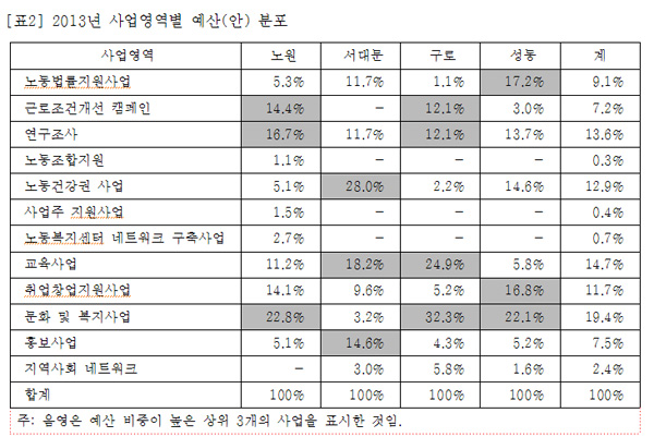 이를 사업영역별로 보면, 다음의 [표2]와 같이 크게 13가지로 분류하고 있습니다. [표2]를 보면 사업영역 중에 문화복지에 가장 많이 투입되고 있다는 점을 알 수 있습니다. 4개 센터 평균을 내면 19.4%입니다. 그 다음으로, 교육, 연구, 노동건강권 사업 순으로 예산이 투입됩니다. 한편, 가장 많은 예산이 투입되는 문화복지사업 센터별로 편차도 가장 심합니다. 즉 서대문 센터는 예산의 3.2%만 문화복지사업에 투입하고 있고, 구로 센터는 30%가 넘습니다. 연구조사는 3순위로 많은 예산이 투입되는 사업인데 편차는 가장 적습니다.