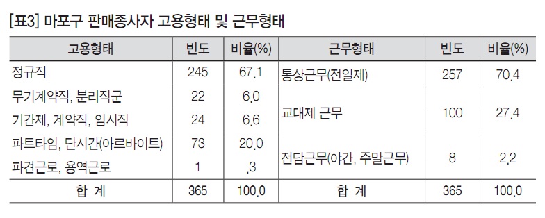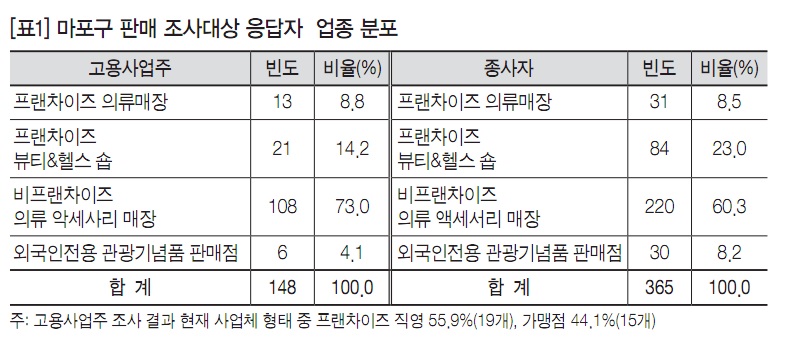 설문조사는 마포구(홍대지구) 관광산업 판매직 종사자 356명과 사업주 148명 등 총 504명을 대상으로 하였다. 판매직 종사자의 60%와 고용사업주의 73%가 비프랜차이즈 의류악세서리 분야 종사자로 가장 많은 비중을 차지했다.