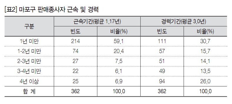 마포구 관광산업 판매종사자의 평균 근속기간은 1.2년이며, 근속기간 1년 미만자는 59.1%다. 그리고 판매직 종사자의 동일업종 평균 경력기간은 3년이며, 이 중 경력 2년 미만자는 46.4%다. 근속기간 및 평균 경력기간은 전체 산업에 비해 상당히 낮은 편이다.