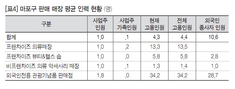 종사자 평균인력 현황은 사업주 1명, 가족 0.1명, 현재 고용인원 4.3명, 외국인종사자는 10.6명이다. 매장별 전체 평균 고용인원은 프랜차이즈 의류매장이 13.5명, 프랜차이즈 Beauty&Health Shop이 5.8명, 비프랜차이즈 의류 악세사리 매장이 1.4명, 외국인전용 관광기념품 판매점이 34.2명으로 비프랜차이즈 매장의 인력 규모가 극도로 작다는 것을 알 수 있다.