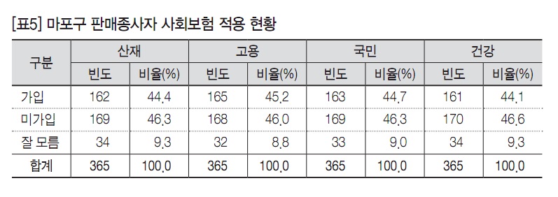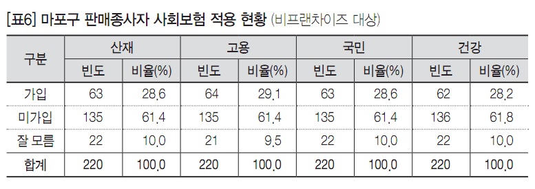 사회보험 가입 현황은 산재보험 44.4%, 고용보험 45.2%, 국민연금 44.7%, 건강보험 44.1%다. 하지만 비프랜차이즈 매장 종사자의 가입률은 각각 28.6%, 29.1%, 28.6%, 28.2%로 평균치를 크게 밑돌고 있다. 정부의 두루누리 사회보험 지원을 적극 고려해야 할 것으로 보인다. 실제 2015년 실태조사에서 두루누리사업의 지원 대상인 월 140만원 미만자의 규모는 마포구 판매종사자의 30%인 것으로 나타났다.