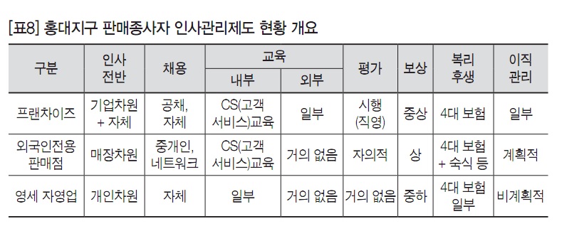 홍대지구의 매장별 인사관리 현황을 정리하면 [표8]과 같다. 프랜차이즈 매장이나 외국인전용 관광기념품 판매점은 영세 매장에 비해 상대적으로 공식적, 체계적인 인력관리가 이루어지고 있다. 프랜차이즈 직영점의 경우는 공식적 관리가 주로 이루어지며, 외국인 판매점은 비공식적이지만 자체 내부노동시장적 성격이 형성되어 나름 체계적인 관리가 이루어지고 있다. 프랜차이즈 가맹점은 공식적 관리와 자체적인 관리가 일부 혼합되어 있으며, 영세사업장의 경우 비공식적이고 자체적인 인사관리가 이루어지고 있다.