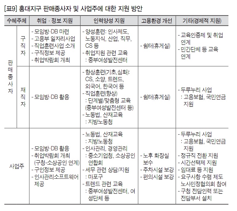 [표9]는 이상의 홍대지구의 판매종사자 및 사업주에 대한 일자리창출 관련 각종 지원 방안을 구직자, 재직자, 사업주 등 수혜주체별로 정리한 것이다.