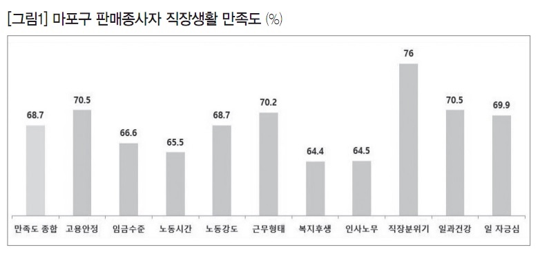 평균 직장생활 만족도는 68.7점(여성 68점, 무기계약직 59.7점, 사원 68.2점, 35세 이상 65.4점, 근속 1년 미만 66.9점)이며, 이 중 평균 이하의 항목으로는 복지후생(64.4.점), 인사노무(64.5점), 노동시간(65.5점), 임금수준(66.6점) 순이다. 비프랜차이즈 매장 종사자의 평균 직장생활 만족도는 69.8점이며, 상대적 만족도가 낮은 항목은 복지후생(64.8점), 인사노무(65.3점)다.
