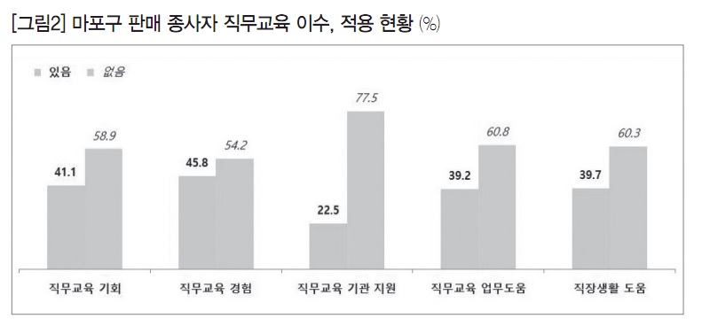 마포구 관광산업 판매종사자의 직무교육 현황을 보면, 직무교육 기회는 41.1%(비프랜차이즈 20%), 직무교육 경험은 45.8%(비프랜차이즈 25%), 직무교육 기관 지원은 22.5%(비프랜차이즈 6.8%), 직무교육의 업무도움 여부는 39.2%(비프랜차이즈 18.6%), 직무교육의 직장생활 도움 여부는 39.7%(비프랜차이즈 18.2%)로 나타났다. 전반적으로 교육기회나 경험이 적기 때문에 효과성 역시 적은 것으로 판단되며, 비프랜차이즈 매장의 경우에는 평균에 비해 절반 미만인 탓에 근본적으로 교육 자체에 대한 기회 제공이 필요한 것으로 판단된다.