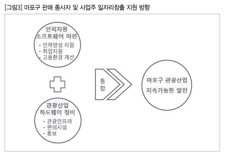 홍대지구 판매종사자 및 사업주에 대한 전반적인 일자리창출 지원방향은 아래의 [그림3]과 같이 ‘관광산업 하드웨어 정비’와 ‘인적자원 지원 소프트웨어 정비’를 통한 ‘관광산업의 지속가능한 발전’으로 도식화할 수 있다. 이는 현재 마포구 차원에서 추진 중인 ‘마포 관광발전 기본계획(2015~2018)’에 따라 홍대지구 편의시설, 홍보, 관광인프라 확충 등 하드웨어 정비와 더불어 관광산업 관련 소매업체 사업주 및 판매종사자에 대한 인적자원 지원방안 마련 등 소프트웨어를 결합하여 홍대지구 관광산업의 지속가능한 발전을 모색하는 것이라 할 수 있다.