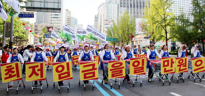 <사진: 4.24 총파업에 참가한 서비스노동자들이 최저임금 인상을 요구하며 거리 행진 중이다. ⓒ한국노동사회연구소>