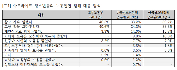 청소년들이 노동인권 침해에 대응하는 방식을 살펴본 바는 다음과 같았다. 먼저 과반 이상의 청소년들은 노동인권 침해 시 대응 방식으로 “참고 계속 일했다”와 “일을 그만두었다”를 꼽았다. 다음으로 고용노동부나 경찰, 교사나 교육청, 민간단체나 상담소 등 외부 단위의 도움을 받은 경우는 모두 합쳐 6% 미만이었다. 마지막으로 “개인적으로 항의하였다”는 응답은 2011년 3.9%가량에서 2013년에는 14.3%로 증가했다. 요컨대 청소년들의 노동인권을 보호하기 위해 만들어진 제도적 기관들의 영향력은 아직 미미하지만, 지난 몇 년간 이뤄진 노동인권교육, 미디어의 보도, 사회단체의 활동 등으로 청소년들의 노동인권에 대한 개인적 자각이 커졌다는 추측이 가능하다.