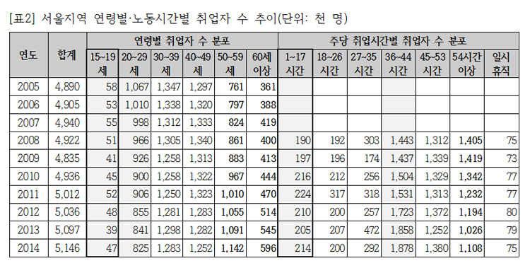 서울시가 제공하는 『서울통계』 (http://stat.seoul.go.kr/)의 데이터베이스를 살펴본 결과, 지난 10년간 서울시의 일자리는 다음과 같은 추세를 보였음을 알 수 있었다. 먼저 서울지역에서 40대 이하 모든 연령의 취업자 수는 지난 10년간 절대 수치가 감소한 반면, 50대와 60대 이상의 취업자 수는 크게 늘었다. 15세에서 20세 미만 연소근로자는 2005년에서 2014년 사이 약 1만 1천 명 감소했고, 20대 취업자 수는 24만 2천여 명이 감소한 반면, 50대와 60세 이상 취업자 수는 각각 37만 9천여 명과 23만 5천여 명이 늘어났다. 다음으로 서울지역에서 주당 평균 취업시간이 줄었고, 주당 17시간 미만 동안 일하는 단시간 취업자 수는 늘어났다. 서울지역의 주당 평균 취업시간은 2008년 46.0시간에서 2014년 44.1시간으로 약 1.9시간 줄었는데, 여기에는 주당 54시간 이상 장시간 일하는 취업자의 수가 같은 기간 동안 크게 감소했다는 점이 영향을 줬다. 한편, 주 40시간 미만의 취업자 상황을 보면 주당 17시간 미만으로 일하는 취업자가 상대적으로 가장 큰 수치인 2만 4천여 명이 늘어난 점이 두드러진다.
