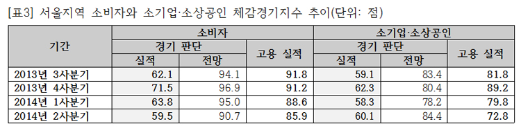 취업자 수가 경기변동에 상대적으로 민감하게 반응하는 경향성은 특히 소기업과 소상공인들에게 더욱 강하게 인식되는 것으로 파악된다. 2013년 3사분기부터 2014년 2사분기까지 체감경기지수 변동을 보면, 소비자의 경우 현재 ‘경기 실적’에 대한 체감경기지수는 최댓값과 최솟값 차가 약 12.0점이었고, 같은 기간 ‘고용 상황’에 대한 체감경기지수의 최댓값과 최솟값 차는 5.9점이었다. 반면 소상공인과 소기업인의 응답 결과에서는 각각 약 4.0점과 16.4점이었다. 요컨대 소상공인과 기업인이 소비자에 비해 경기실적에 따른 고용 상황 변동에 대해 훨씬 민감하게 인식하고 있다고 할 수 있다. 청소년 일자리의 대부분이 5인 미만 서비스부문인 것을 고려하면, 청소년들의 고용상황과 노동조건은 경기에 매우 민감하게 반응할 것이라 추측할 수 있다.