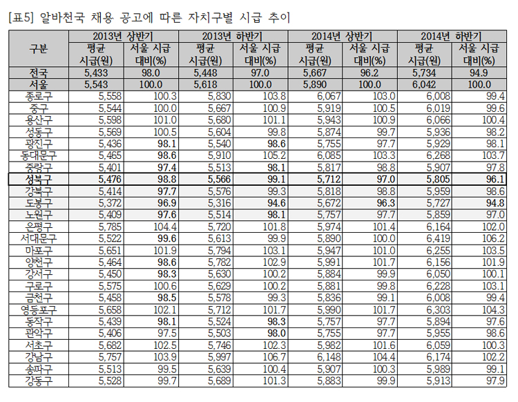 아르바이트 구인사업주와 구직자를 연결해주는 인터넷 사이트인 ‘(주)아르바이트천국’ (이하 알바천국)에 게시된 채용 공고를 분석하여, 자치구별 아르바이트 시급을 살펴본 결과는 다음과 같았다. 먼저 전국단위 아르바이트 시급과 서울지역 아르바이트 시급의 격차가 확대되고 있다. 서울 대비 전국 아르바이트 시급 비중은 2013년 상반기 98.0%에서 2014년에 94.9%까지 떨어졌다. 다음으로, 성북구의 아르바이트 시급은 전국 수준보다는 높지만 서울지역 시급과의 격차는 벌어지고 있다. 2013년 성북구의 알바천국 채용 공고 아르바이트 시급은 서울지역 대비 98.8%였는데, 2014년 하반기에는 96.1%였다. 2014년 하반기 성북구의 아르바이트 시급은 전체 자치구 중 24위로 도봉구를 제외하고는 가장 낮았다.