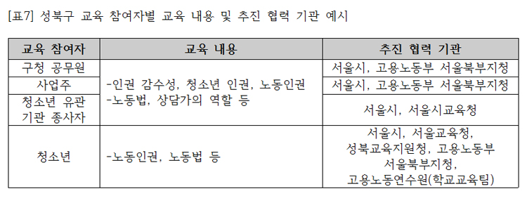 성북구청 담당자, 지역 노동인권 전문가, 고용노동지청 담당 감독관, 안심알바신고센터 청소년 운영위원, 사업주단체 등이 참여하는 민관협의체를 구성할 필요가 있다.