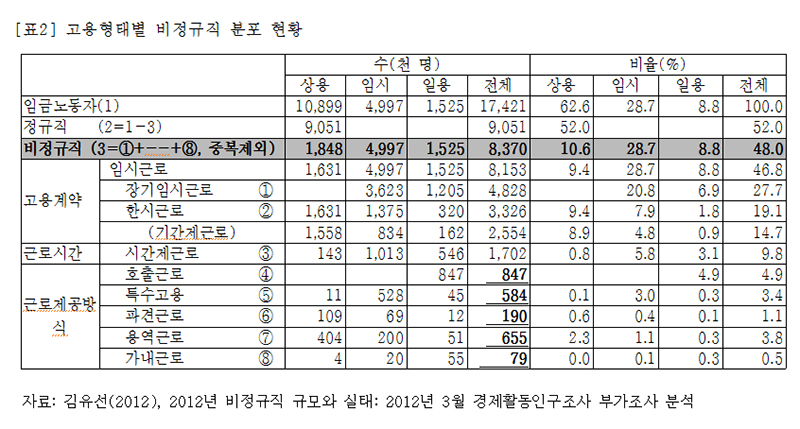비정규직 노동자의 고용형태별 실태를 보면, 호출근로 84만 7천 명, 용역근로 65만 5천 명, 특수고용 58만 4천 명, 파견근로 19만 명, 가내근로 7만 9천 명이다. 이들을 합치면 235만 5천 명에 달한다. 즉, 약 235만 5천 명 비정규직 노동자들의 경우, 자영업자-갑을관계의 성격이 혼재하고 있기 때문에 ‘갑을관계’ 이슈를 매개로 사업자단체의 결성 및 협의권을 제도화하고, 실질적인 단체교섭을 통해서 ‘대항력’을 형성할 수 있는 여지가 존재한다.