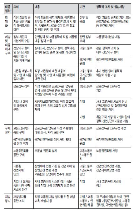 직장 괴롭힘에 대한 신속한 대응의 필요성을 고려하여 보았을 때 조직 내부의 사내 고충처리 시스템을 정비하는 것은 무엇보다 중요한 과제다. 하지만 경영전략 또는 가학적 노무관리의 형태로 야기되는 괴롭힘은 그 목적과 가해자의 요인을 고려하였을 때 사내 절차에 따라 해결되기 어렵고, 노동위원회, 고용노동부, 국가인권위원회 등 각 기구들이 적절한 역할을 해주는 것이 중요하다. 기존의 노동 사건과 연동하여 문제를 다루기 위해서는 노동위원회와 고용노동부가 유리한 점이 있지만, 직장 괴롭힘을 ‘인권 존엄’ 문제로 파악하고 노동자의 인권을 적극적으로 보장하기 위해서는 인권옹호기구인 국가인권위원회의 역할도 중요하다고 판단된다. 다만 이들 외부 기구들이 직장 괴롭힘에 적절히 대처하기 위해서는 충분한 인력과 전문성 확보 등의 조치가 필요할 것이다. 이러한 내용을 정리하면 아래의 표와 같다.