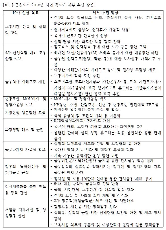금융노조는 지난 2018년 1월 24일 정기대의원대회에서 금융 공공성 강화와 관치금융 철폐, 양극화 해소, 과당경쟁 근절, 생존권 사수를 핵심으로 10개 실천사항을 의결했다. 10개 실천사항은 △노동시간 단축 및 삶의 질 향상 △4차 산업혁명 대비 고용안정 확보 △금융회사 지배구조 개선(경영참가, 임원선임절차 투명성 강화) △협동조합 MOU 폐지 및 경영 자율성 확보 △지방은행 생존방안 모색(특위 구성) △핵심성과지표(KPI) 제도 개선 및 공공성 파괴, 소비자 피해 초래하는 과당경쟁 근절 △금융공기업의 경영자율성 확보 및 실질적 노정교섭 제도화 △정부의 낙하산 인사 및 관치금융 근절 △정치세력화를 통한 친노동 정책 관철(6·13 지방선거) △저임금직군 처우개선 및 양성평등 실현 등이 포함된다. 이러한 사업 목표를 달성하기 위한 추진방향은 다음의 [표 1]과 같다.