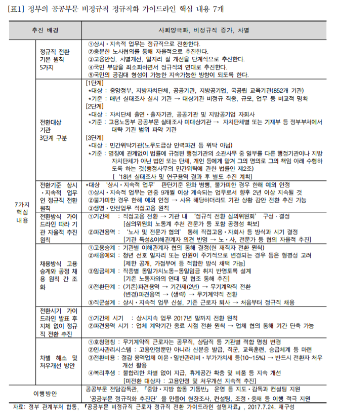 지난 7월20일 정부는 관계부처 합동으로「공공부문 비정규직 근로자 정규직 전환 가이드라인」(이하 가이드라인)을 발표했다. 일선 현장에는 7월24일 해설 자료가 배포되었기에 실제 시행 시점을 둘러싼 차이도 있다. 정부의 공공부문 가이드라인은 국가일자리위원회 공공부문 좋은 일자리와 연동된다. 공공부문 비정규직의 정규직화는 대통령의 공약이기도 했고, 문재인 정부 국정과제에 포함된 정책이기도 하다.