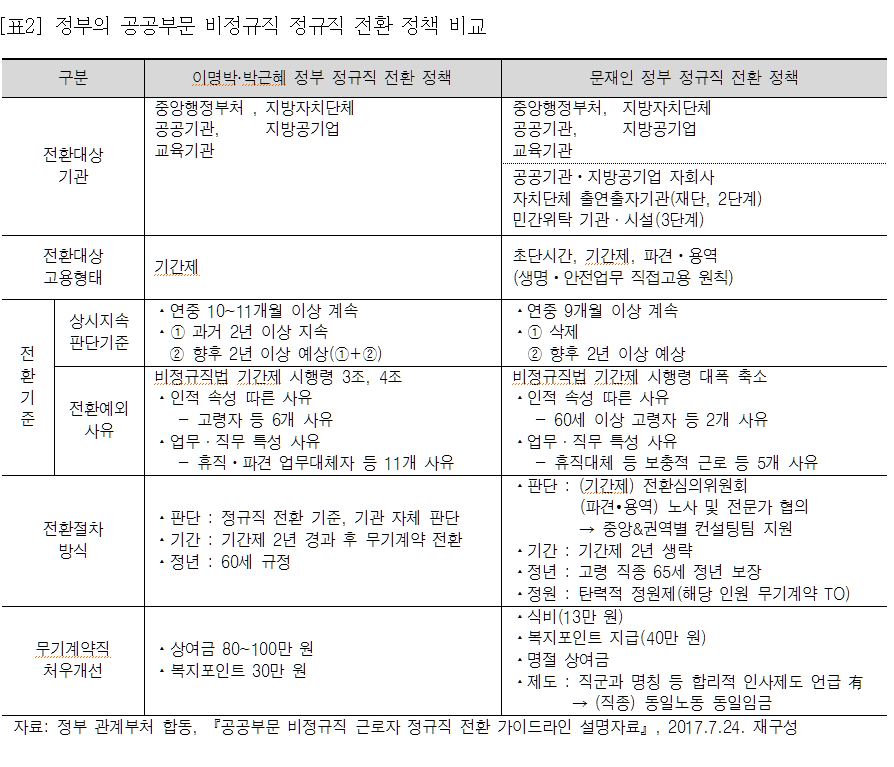 이번 공공부문 비정규직의 정규직 전환을 ‘고용불안 해소(1차)’와 ‘차별개선(2차)’을 방향으로 잡고 있어 임금과 복지 및 처우개선에 대해서는 점진적 해결을 목표로 한다. 때문에 이번 비정규직 정규직 전환에서 말하는 ‘정규직’은  ‘계약기간의 정함이 없는 무기계약’ 전환을 뜻한다. 물론 개별기관에서 동일 업무를 수행하는 비정규직의 정규직 전환 신청에는 여지를 열어두었다. 문제는 2017년 하반기 정규직 전환에 따른 소요재원은 기관별 자체재원을 활용하도록 했고, 재정적 여력이 없는 기관은 기존의 근로조건을 2018년 예산 집행 시까지 유지할 수 있도록 했다.