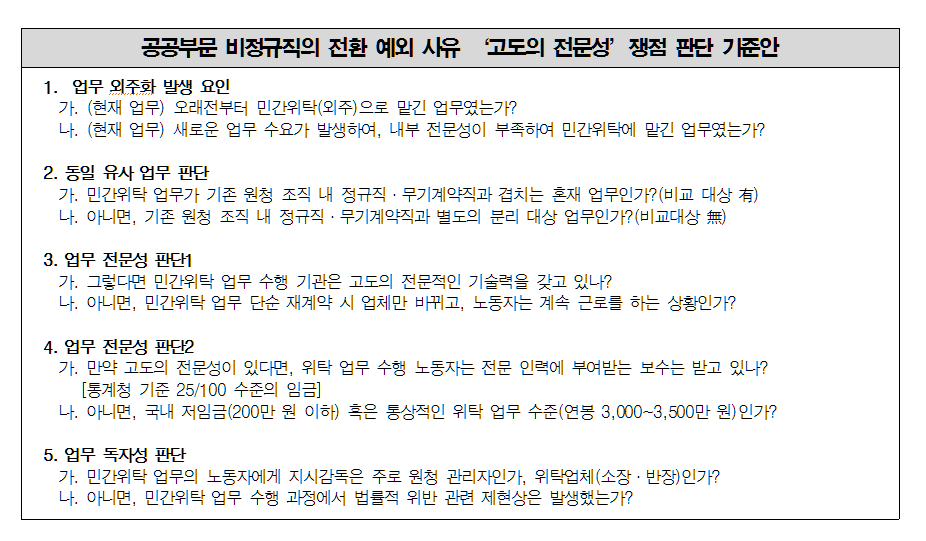 다섯째, 정규직 전환 예외조항의 ‘고도의 전문성’을 둘러싼 쟁점이다. 거의 대부분의 기관에서 기간제(변호, 회계, 통계, 번역 등)와 파견용역(IT, 콜센터 등) 일부 업무를 전환 제외로 하고 있다. 문제는 과연 이 업무를 전환 예외 사유로 판단할 것인가이다. 이와 같은 업무가 고도의 전문성을 가진 것으로 예외를 인정받기 위해서는 논리적 정합성과 타당성이 있어야 한다. 다수의 기관 담당자를 만나고 자문하면서 기준과 원칙을 아래와 같이 정리해 보았다. 5개의 논리(Logic)에 모두 반박이 가능하다면 합리성이 인정되는 ‘고도의 전문적인 외주화 가능 업무’로 볼 수 있을 것 같다.