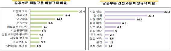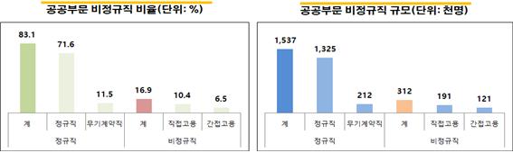 2016년 기준 공공부문 종사자 규모는 정규직132만5천 명, 무기계약직 21만2천 명이다. 공공부문 내 비정규직 규모는 31만2천 명(직접고용 비정규직 19만1천 명, 간접고용 비정규직 12만1천 명)으로 전체 공공부문의 16.9% 정도다. 현재 공공부문 직접고용 비정규직 내 4개 직종(기간제 교사 27.4%, 사무보조 18.6%, 연구보조 14.2%, 운동선수 9.6%)이 69.8%를 차지하고, 간접고용 비정규직 내 4개 직종(청소 33.2%, 경비 23.4%, 시설관리 16.9%, 환경미화 8.8%)이 82.2%를 차지하고 있다. 결국 공공부문 비정규직 감축 해결은 고용형태별 주요 직종의 정규직 전환이 핵심이라 할 수 있다.