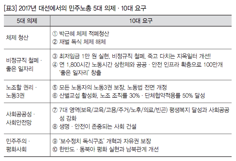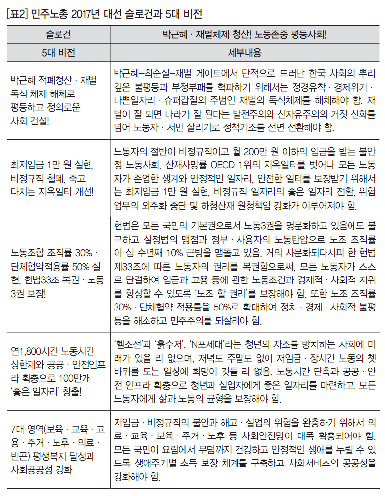 민주노총은 이번 대선에서 ‘박근혜·재벌 체제 청산과 노동존중 평등사회 건설’을 핵심 기치로 하여 박근혜 적폐청산․재벌 독식 체제 해체, △최저임금 1만 원 실현, 비정규직 철폐, 죽고 다치는 지옥일터 개선, △노조 조직률 30%·단체협약 적용률 50% 실현, 노동3권 보장, △연 1,800시간 노동시간 상한제와 공공·안전 인프라 확충으로 100만개 ‘좋은 일자리’ 창출, △7대 영역(보육·교육·고용·주거·노후·의료·빈곤) 평생복지 달성과 사회공공성 강화를 핵심 요구로 제시한다.