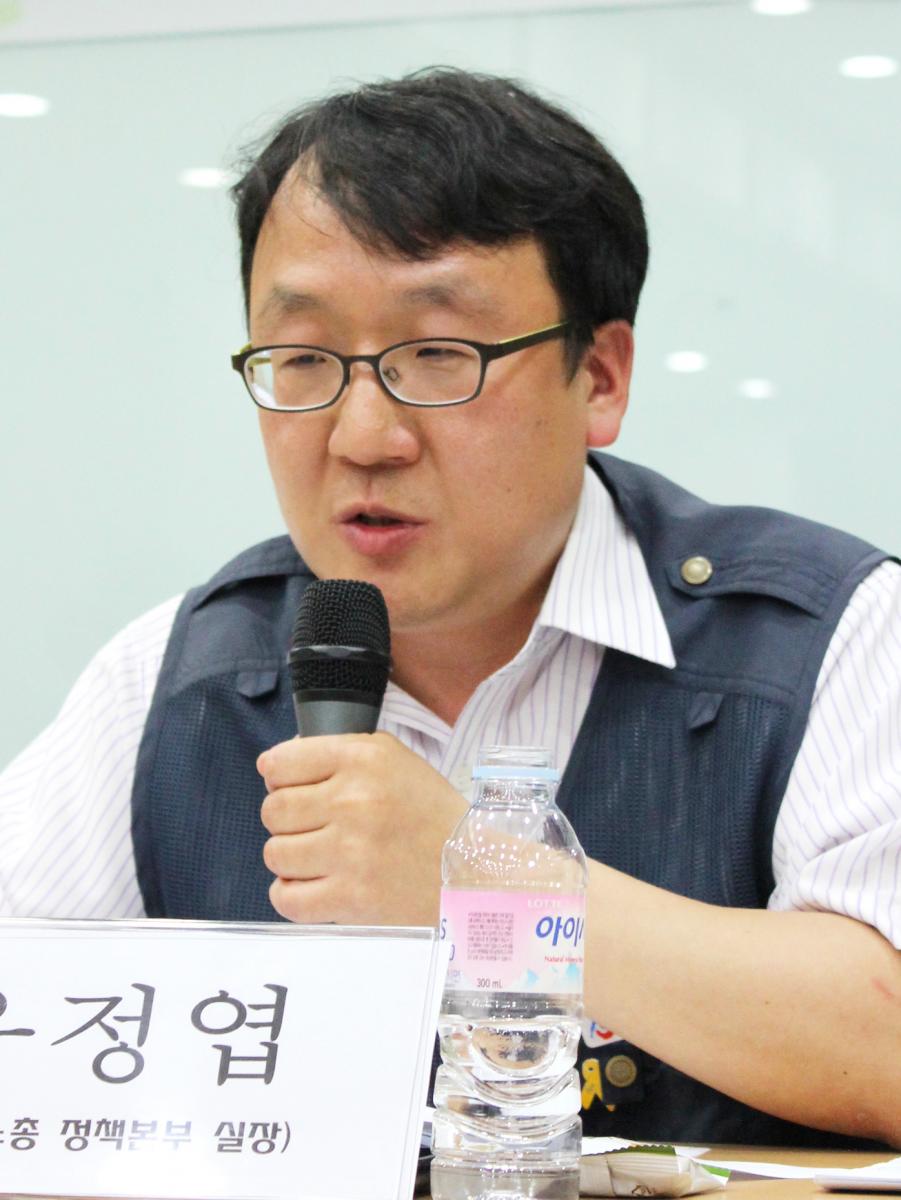유정엽) 한국노총은 아시다시피 대선 때 문재인 후보와 정책연대 협약을 맺었습니다. 현재는 노동계의 요구를 관철하고자 노력 중입니다. 오늘 토론은 거창하게 노동운동의 전략을 얘기하기보다는 새 정부의 노동정책 추진 과정에서 어떤 우선순위를 갖고 정부 정책에 접근해야 하는지, 또 우려되는 점을 중심으로 말씀드리겠습니다. 새 정부의 노동정책은 노동존중 사회, 좋은 일자리 정책으로 요약됩니다. 노동계의 요구사항이 실현되고 새 정부의 공약이 이행되려면, 노조의 기능과 역할이 확대되고, 노사관계의 불균형이 해소되어야 합니다. 문제는 정부의 인식이나 움직임 속에 이러한 내용이 담겨있긴 하지만, 굉장히 약하다는 것입니다. 그래서 최저임금 1만 원 인상, 비정규직의 정규직화 등 이벤트성 정책을 내놓고 있는데, 노동정책의 지속가능성을 위한 노조 조직률 제고, 초기업단위의 교섭력 강화에 대해서는 좀처럼 언급이 없어 아쉽습니다.