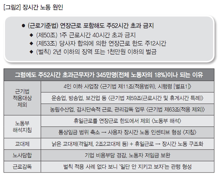 이처럼 탈법적인 장시간 노동이 만연한 데는 여러 가지 원인이 맞물려 있다. 첫째, 근로기준법 제11조(적용범위)와 시행령 제7조 [별표1]이 4인 이하 사업장을 근로시간 적용대상에서 제외하고, 근로기준법 제59조(근로시간 및 휴게시간의 특례)와 제63조(적용의 제외)가 여러 산업과 업무를 적용대상에서 제외하고 있다.