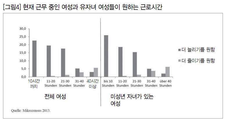 [그림4]에서 보는 바와 같이 시간제 근무를 하는 여성의 11.5%는 더 많은 노동시간을 원하고 있다. 반면 시간제 근무를 하는 여성 중 2.1%의 여성만이 노동시간의 단축을 원하고 있다. 즉, 2백만 명의 독일 여성들은 더 많은 노동을 할 준비가 되어 있고, 이 숫자에는 80만 명의 유자녀 여성들도 포함된다. 특히 노동시간을 늘리고 싶어 하는 여성의 숫자는 현재 노동시간이 짧을수록 더 높아진다. 그러나 노동시간 증가를 원하는 여성들이 반드시 노동시간을 늘리는 방법을 찾거나 전일제 일자리를 찾고 있는 것은 아니다. 왜냐하면 여전히 가사와 양육, 가정 내 돌봄을 해야 하기 때문이다. 이러한 현상은 전문 지식과 기술이 있느냐 없느냐에 상관없이 미성년자인 자녀가 있는 여성들에게 전반적으로 나타고 있다.