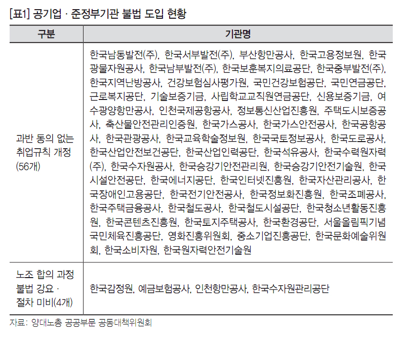 기획재정부는 6월 10일 보도자료를 통해 “지난 1월 공공기관 성과연봉제 권고안(1.28) 발표 후, 도입 대상 전(全) 공공기관이 성과연봉제 확대 도입을 완료하였다” 발표하였다. 정부도 스스로의 잘못을  감추기 위함인지 120개 기관이 성과연봉제를 도입했지만, 그 중 몇 개 기관이 노조와의 합의를 통해 성과연봉제를 도입했는지는 밝히지 않고 있다. 양대노총 공공부문노동조합 공공대책위원회의 조사에 따르면 정부가 성과연봉제 확대 도입을 마무리했다고 밝힌 120곳 중 미파악된 9개 기관을 제외한 111개 기관 중 무려 60개 기관이 과반수 동의 없는 취업규칙 개정, 노사합의 과정에서의 불법 강요와 절차 미비 등으로 불법성이 문제가 되고 있다([표1] 참조). 노사합의 없이 성과연봉제를 도입한 경우, 해당 기관 경영진은 근로기준법 제94조를 위반했다는 비난을 받을 수밖에 없다. 이런 공공기관 경영진들의 불법 행위는 노조만의 일방 주장이 아니라 더불어민주당의「공공·금융부문 성과연봉제 관련 불법·인권유린 실태에 대한 진상조사단 조사결과」 보고서에서도 확인된다. 대표적인 불법 사례는 다음과 같다. 한국중부발전은 관리자들이 성과연봉제 확대 동의서를 받는 과정에서 협박과 폭언을 한 것은 물론, 군 입대한 직원들까지 찾아가 동의서 징구를 시도한 사실이 밝혀지면서 인권유린 논란이 거셌다. 또한 A기관의 경우 직원 동의서 징구 과정에서 부서별 할당을 부여하거나, 찬·반 여부를 인사평가에 반영하겠다는 부당한 지시를 내렸다. 그럼에도 직원들의 동의가 저조하자 상급자에 의한 면담이 적게는 3번에서 많게는 11번이나 강제되는 등 강압적인 동의서 징구가 있었다. 한국보훈복지의료공단의 경우 관리이사와 행정지원실장이 휴일에 노조 지부장 자택을 찾아가 5시간에 걸쳐 초인종을 누르며 성과연봉제 합의를 요구했다. 지부장이 합의해 주지 않자 공단은 서면으로 이사회를 열어 보수규정 개정안을 강행처리했다.