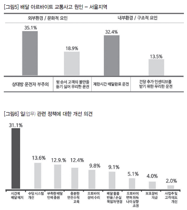 넷째, 교통사고 원인은 △시간제 배달 운전(40%, 일반 배달 32.4%), △건당 인센티브제(20%, 일반 배달 13.5%)라는 의견이 가장 많았고, 배달 교통사고 개선방안으로는 △시간제 폐지(26.5%, 일반 배달 31.1%)와 △수당제 개선(18%, 일반 배달 13.6%)이 다수로 제시됐다([그림6]).