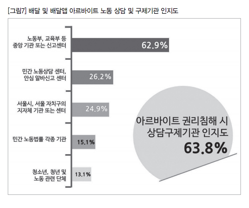 그간 우리 사회에서 배달 아르바이트 노동문제가 사회적 쟁점이 되었음에도 상담 및 구제기관에 대한 인지도는 아직 미약하다. 배달 및 배달앱 아르바이트 노동자를 대상으로 ‘노동권리 침해 시 도움 받을 수 있는 기관 인지 여부’를 설문조사한 결과 10명 중 6명 정도(63.8%)가 알고 있다고 답했다. 권리구제 상담기관의 인지도는 중앙부처(62.9%)가 서울 및 자치구(24.9%)에 비해 2.5배 정도 높았다. 반면 민간 노동상담 센터나 안심알바신고센터(26.2%), 민간 노동법률 각종 기관(15.1%), △청소년·청년 및 노동관련 단체(13.1%)를 알고 있다고 답한 비율은 10명 가운데 2명 내외에 불과했다.