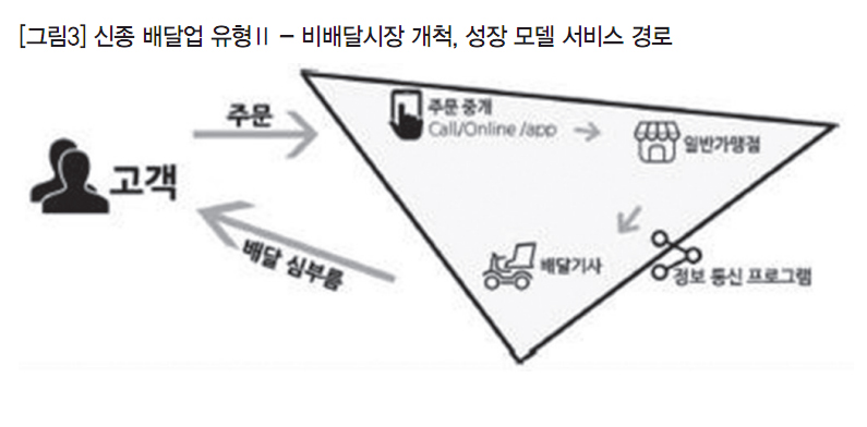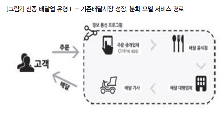 기존 배달서비스는 고객이 직접 배달업체(음식점)에 주문을 하면, 음식점이 직접 고용한 배달원을 통해 음식을 배달한다. 고객과 배달음식점 양자 간에 직접 주문과 배달이 이루어지는 구조다. 그런데 신종 배달업(배달앱)은 기존 배달음식점이 전담하던 역할을 분화시켜 새로운 시장을 만들었다. 새로운 배달시장은 배달 주문접수 단계에서 시장을 만든 ‘주문중개업’과 음식배달 단계에서 시장을 형성한 ‘배달대행업’으로 구분된다.