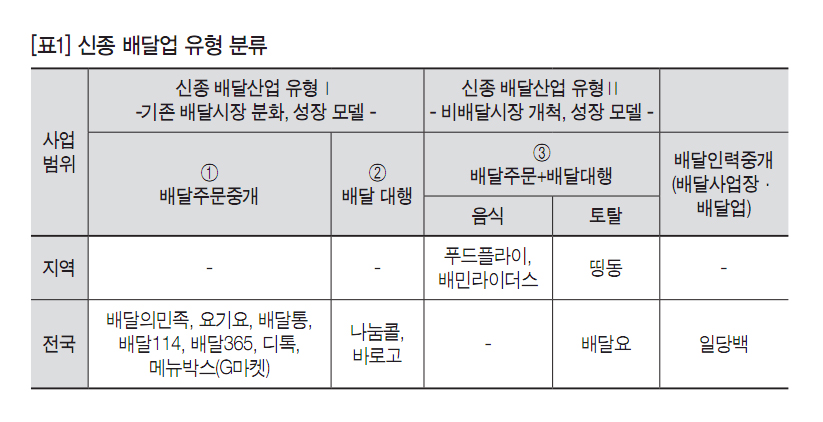 현재 주요 신종 배달업체와 배달중개업체는 배달형태와 유형을 중심으로 △배달주문중개(배달의민족, 요기요, 배달통, 배달114, 배달365, 메뉴박스, 디톡), △음식 배달대행(나눔콜), △배달주문 및 대행(푸드플라이, 배민라이더스), △토탈 배달대행(띵동, 배달요, 바로고몰), △배달인력중개(일당백) 5가지 형태로 구분할 수 있다.