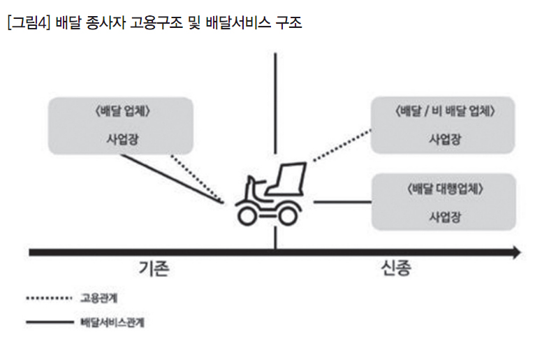 배달업 노동시장의 변화는 고용관계 변화를 수반한다. 최근 새로운 배달업체 및 중개업체 종사자들은 전통적인 근로계약을 체결하지 않고, 새로운 근로계약 방식을 체결하거나 묵시적 계약 방식 혹은 계약조차 체결하지 않는 형태로 고용관계를 맺고 있다. 새로운 계약 방식의 노동자는 근로기준법상 근로자 지위를 인정받지 못하고 개인사업자 형태의 특수형태근로종사자나 자영업자로 구분될 개연성이 높다. 따라서 헌법에 보장된 노동권은 물론 사업장에서 계약존속 보호, 보수지급 보호, 산업안전보건, 구제신청, 권리분쟁 등의 사각지대에 놓여 있다.