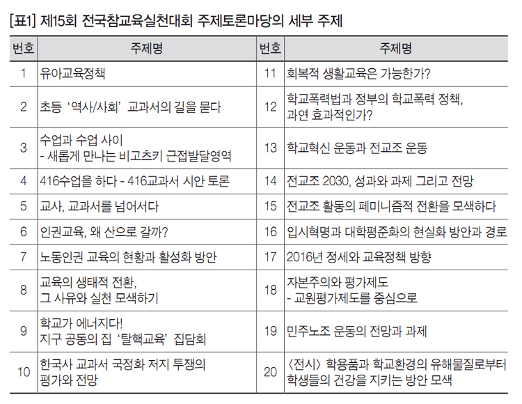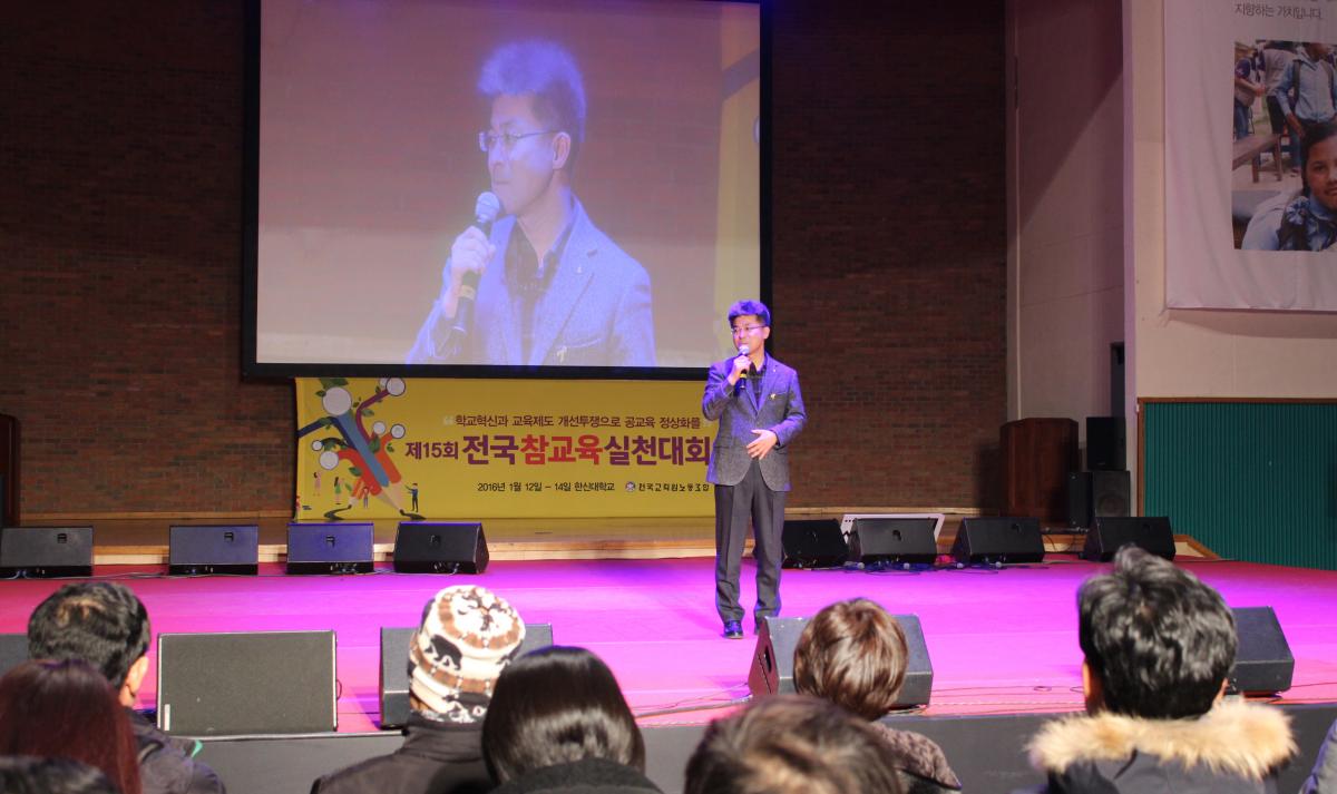 전교조는 2016년 1월 12~14일까지 2박 3일 동안 경기도 오산시에 위치한 한신대학교에서 제15회 전국참교육실천대회(이하 ‘참교육대회’)를 개최했다. 전국 규모 행사인 참교육대회는 학교현장의 혁신과 교사 전문성 고양을 선도하는 주요 흐름을 해마다 한눈에 조망하고, 참교육 실천을 결의하는 장이기도 하다. 전국의 교사들이 한자리에 모여 참교육실천 사례를 발표하고 공유한다. 참교육대회에는 교사뿐만 아니라 예비교사, 청소년, 학부모가 함께하며, 올해는 전국 각지에서 800여 명이 참석했다. 이번 대회의 총 주제는 ‘학교혁신과 교육제도 개선투쟁으로 공교육 정상화를’이다.