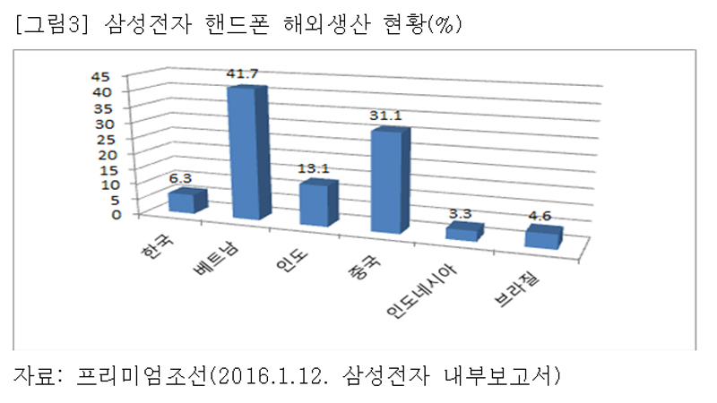 반면 해외생산 비중은 계속 증가하여 2016년 주력산업인 핸드폰과 자동차의 많은 부분이 해외에서 생산될 계획이다. 삼성전자는 올해 생산하는 핸드폰(스마트폰+피처폰)의 93.7%를 해외에서 생산하며, 국내에서는 6.3%만을 구미공장에서 생산할 계획이다([그림3] 참조).