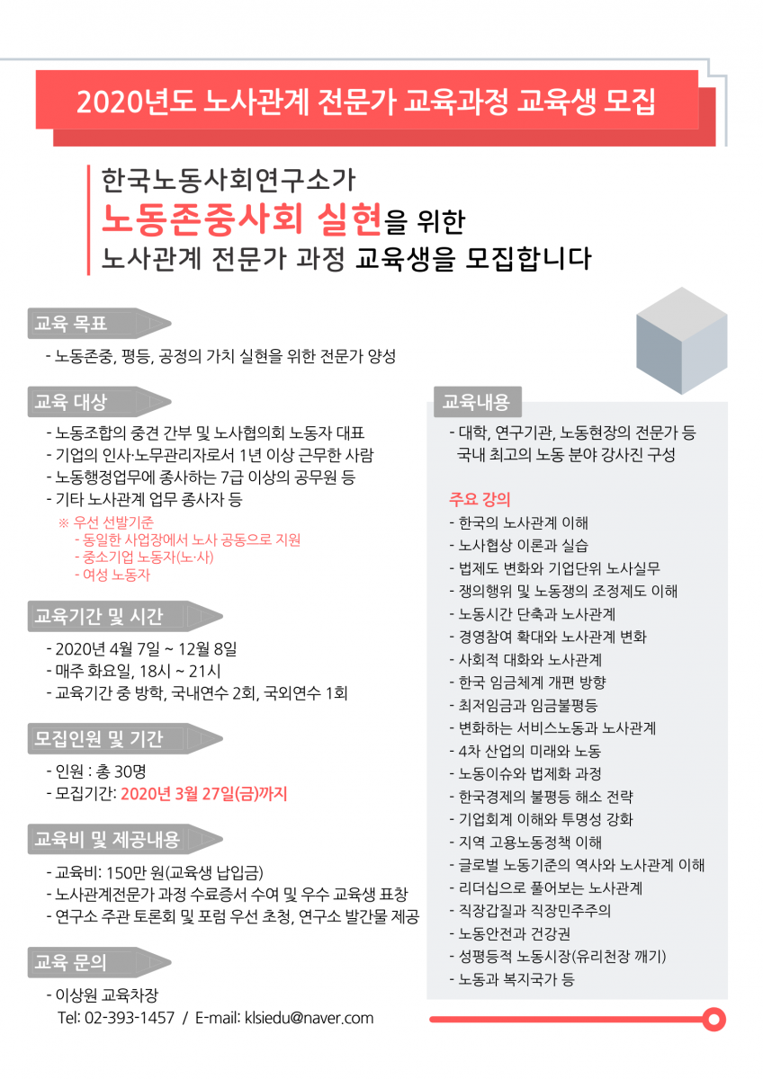 한국노동사회연구소가 노동존중사회 실현을 위한 노사관계 전문가 과정 교육생을 모집합니다.
